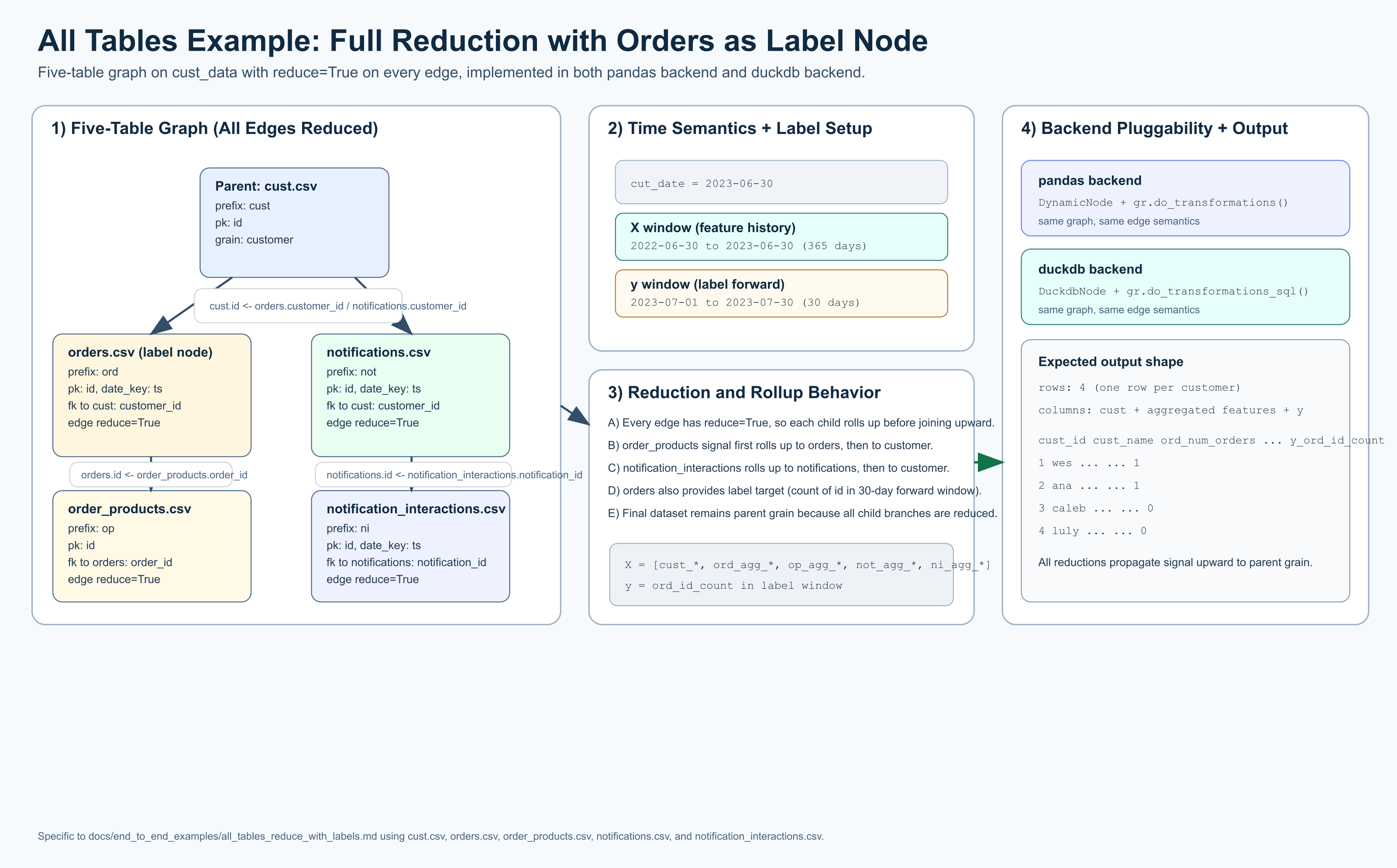 - Because all edges are reduced, output returns to parent grain (one row per customer).